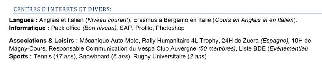 • Vos activités extra-professionnelles : Celles-ci doivent être actuelles et redondantes. Il est préférable de donner un maximum de précisions, par exemple plutôt que "lecture", on va préférer "lecture de romans historiques". Si ces activités sont en adéquation avec le poste visé, c'est encore mieux !