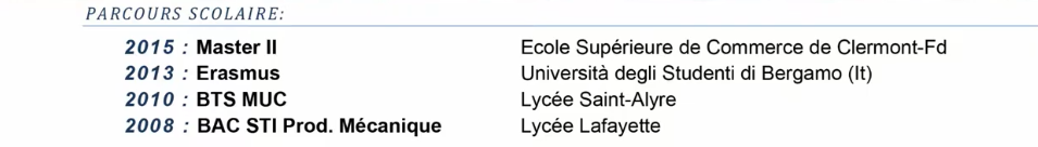 Il faut toujours préciser le niveau de formation ou du diplôme (comme dans l'exemple). En effet, comme nous l'avons expliqué précédemment, les recruteurs regardent le niveau, ensuite où vous avez fait votre formation (pas d'obligation de spécifier le lieu). Concernant la ou les dates, il suffit de mettre l'année de passage de l'examen ou de la formation. Vous pouvez aussi indiquer les autres formations que vous avez pu réaliser pendant votre parcours. De plus, vous devez impérativement mettre le poste visé, et si possible l'intitulé exact de l'offre d'emploi.